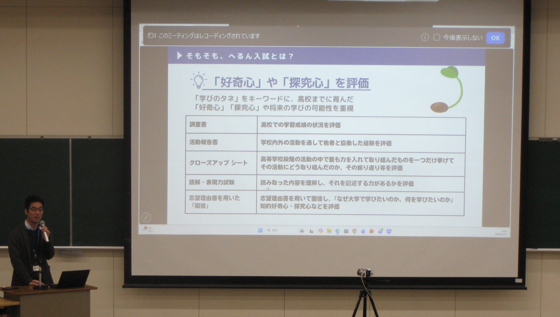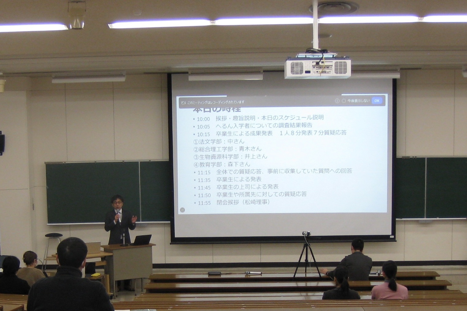 発表会は対面、オンラインで実施し、吉崎聡一講師による、卒業生へのアンケート調査に関する報告ののち、へるん入試で入学し、今年度卒業を迎える法文学部、教育学部、総合理工学部、生物資源科学部の4名の学生による、自身の大学生活や、卒業後の進路や新たな目標についての発表がなされました。